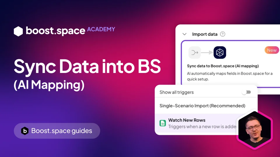 Sync Data into Boost.spaceA platform that centralizes and synchronizes company data from internal and external sources, offering a suite of modules and addons for project management, CRM, data visualization, and more. Has many features to optimize your workflow!: AI MappingIn Boost.space, AI Mapping is a feature that automatically analyzes incoming data from external tools and maps it to the correct custom fields in a table. Instead of manual field mapping, the system recognizes the data structure and assigns values to the appropriate columns, suggesting new fields if needed.