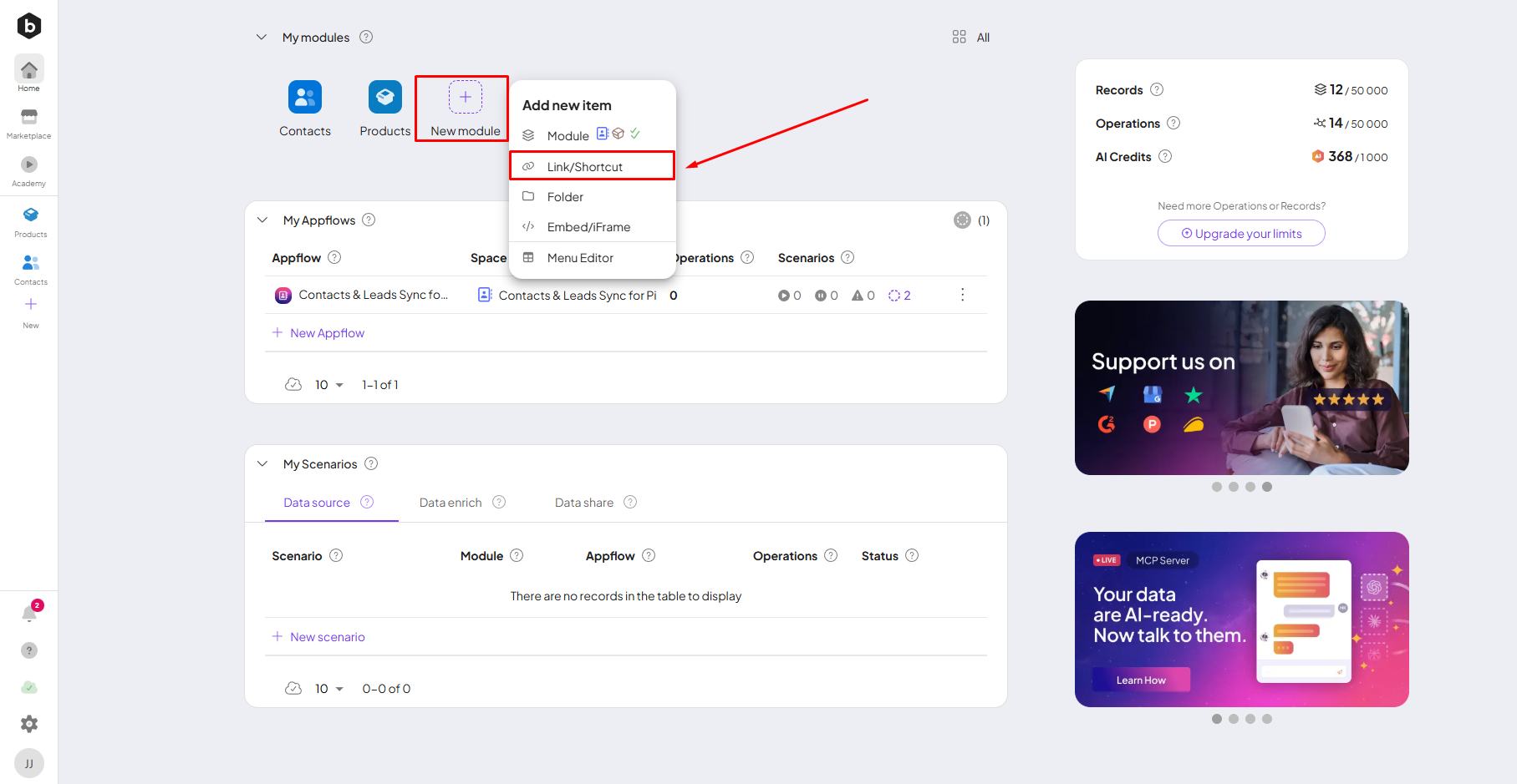 1. Open your homepage and click on “New module” and choose Link/shortcut from the options.