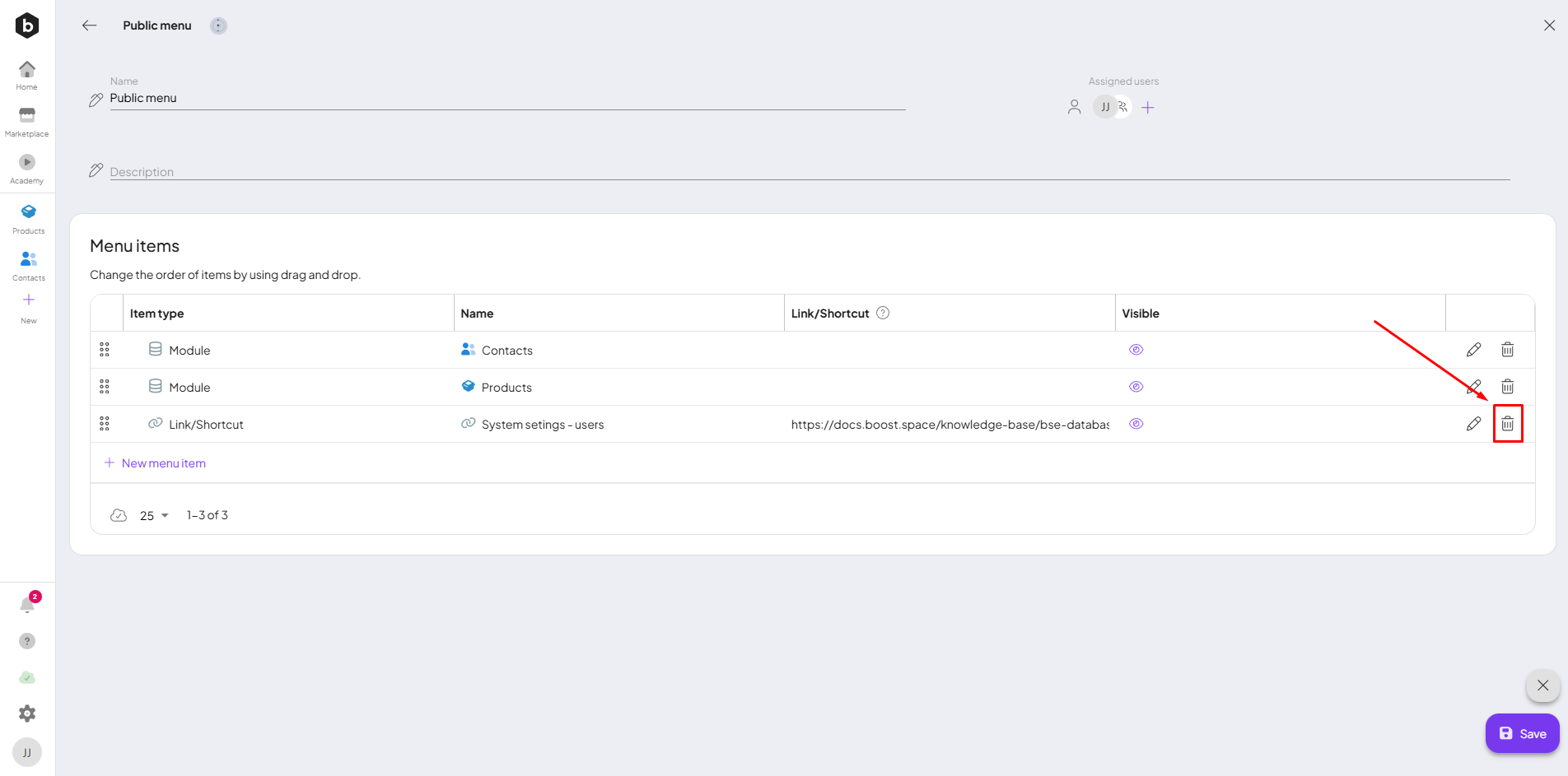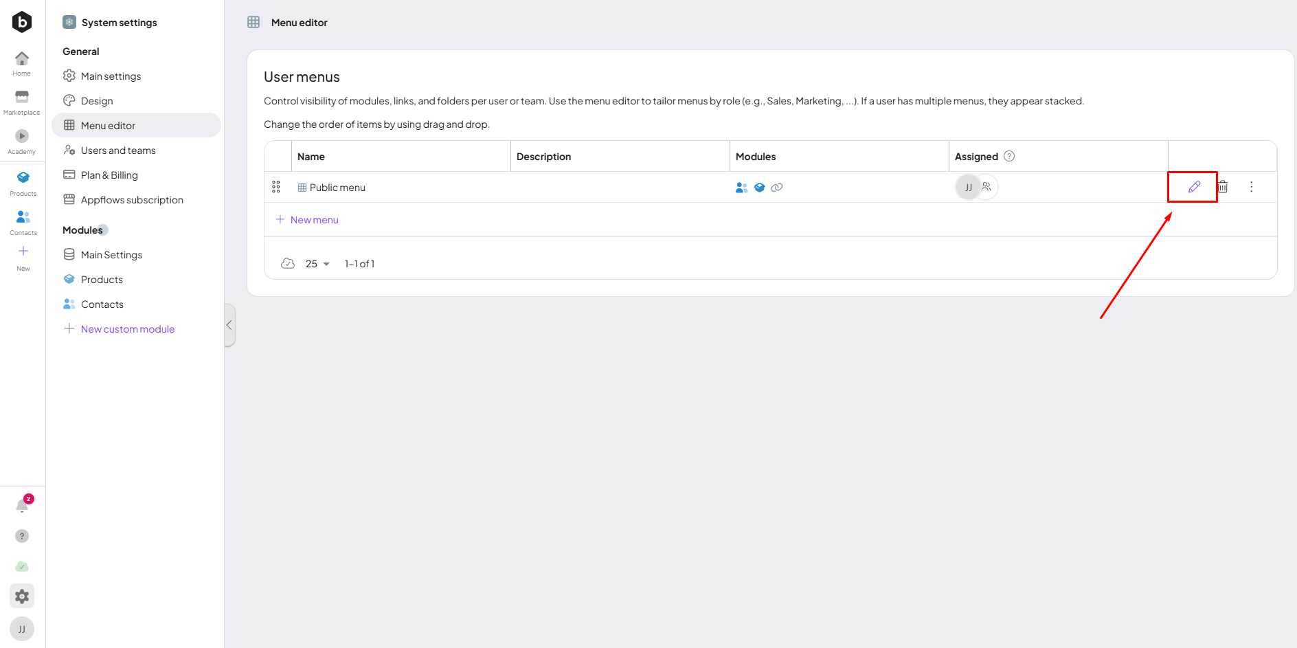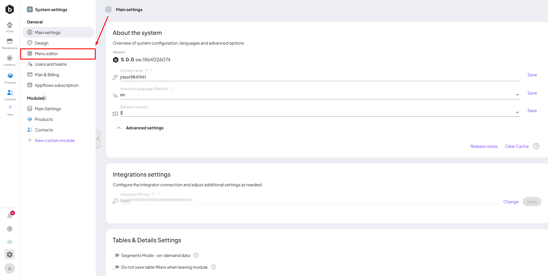 2. Find and open the Menu editorIn Boost.space, the Menu Editor is a feature that allows administrators to customize the system's navigation interface. It enables the creation and management of menus by adding modules, folders, shortcuts, and embedded content. Administrators can tailor menus for individual users, controlling their access to specific modules and enhancing overall user navigation..