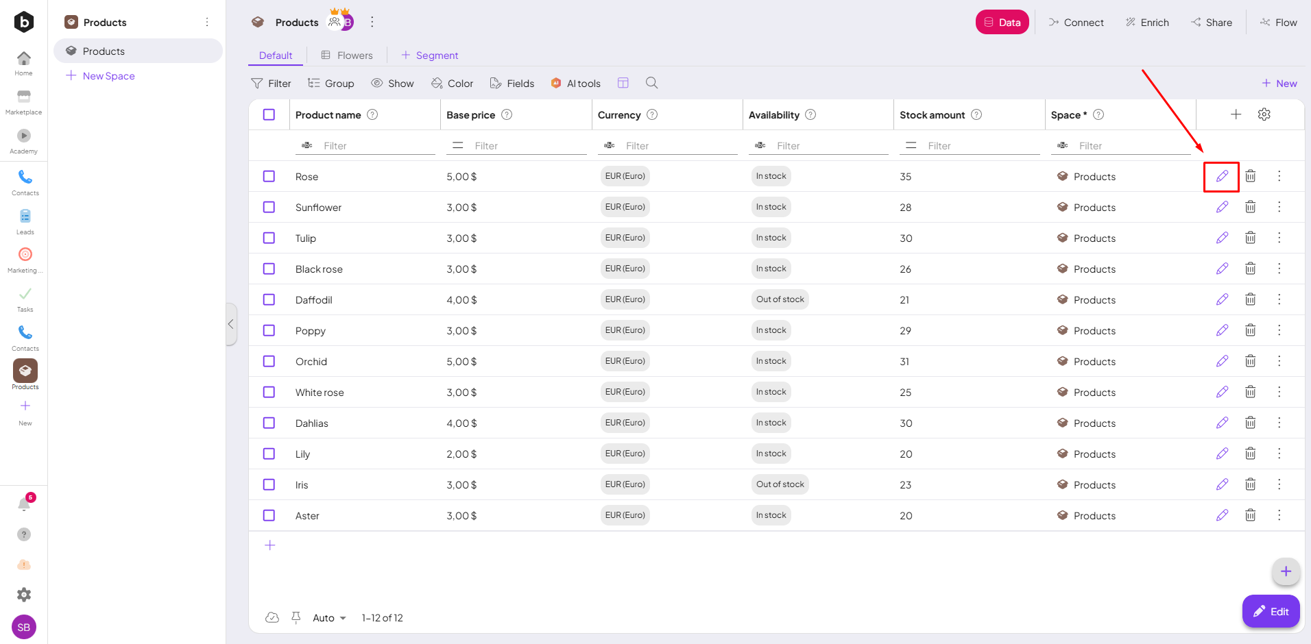 Editing a recordIn Boost.space, a record is a single data entry within a module, like a row in a database. For example, a contact in the Contacts module or a task in the Tasks module. takes place inside the record detail, so you need to first open the record by clicking the pen icon/edit button.