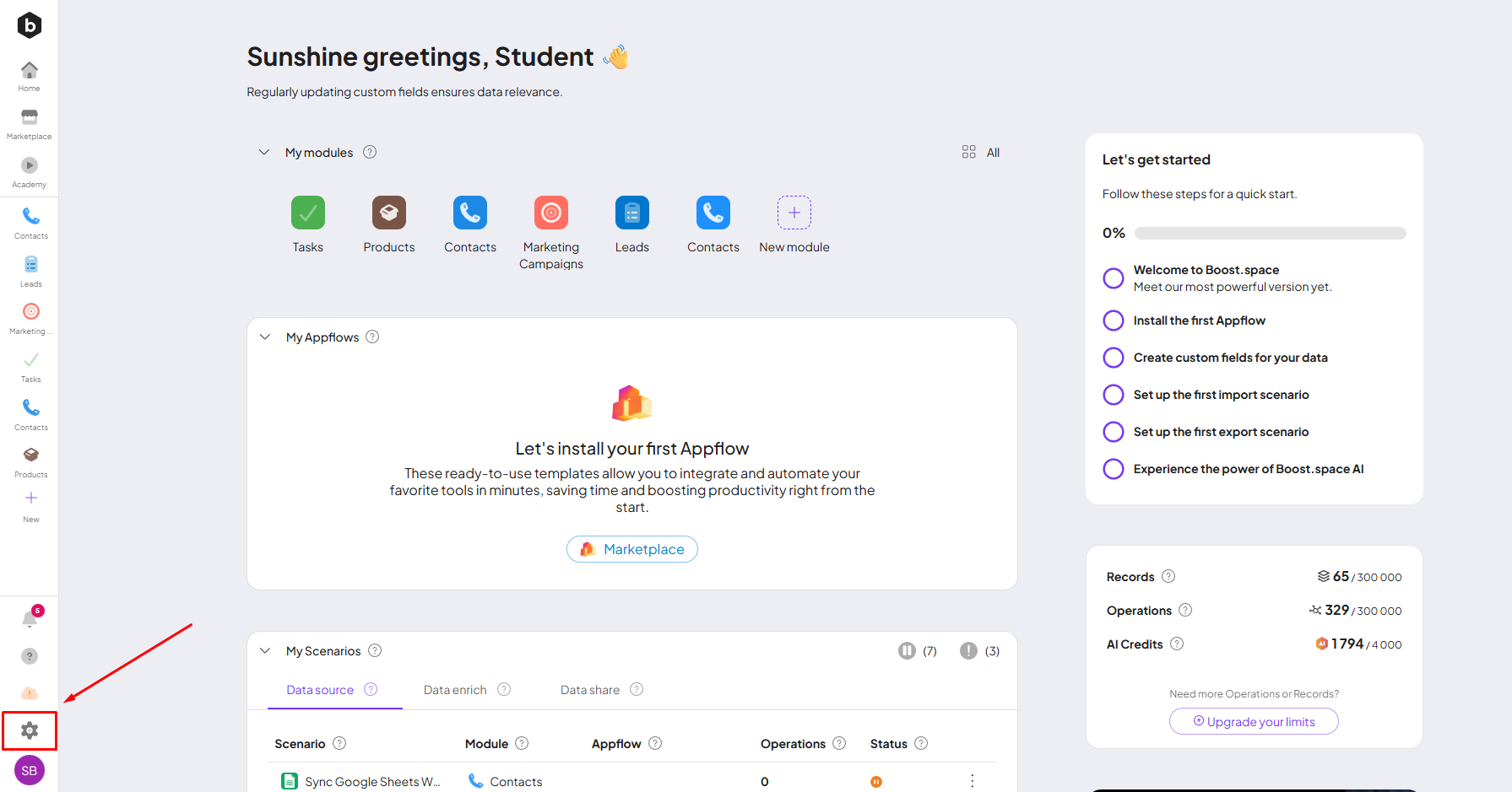 1. Navigate to your system settingsMain settings of the Boost.space system that is accessible only by admins. You can change a variety of things here (custom fields, actions and triggers, design, etc.)