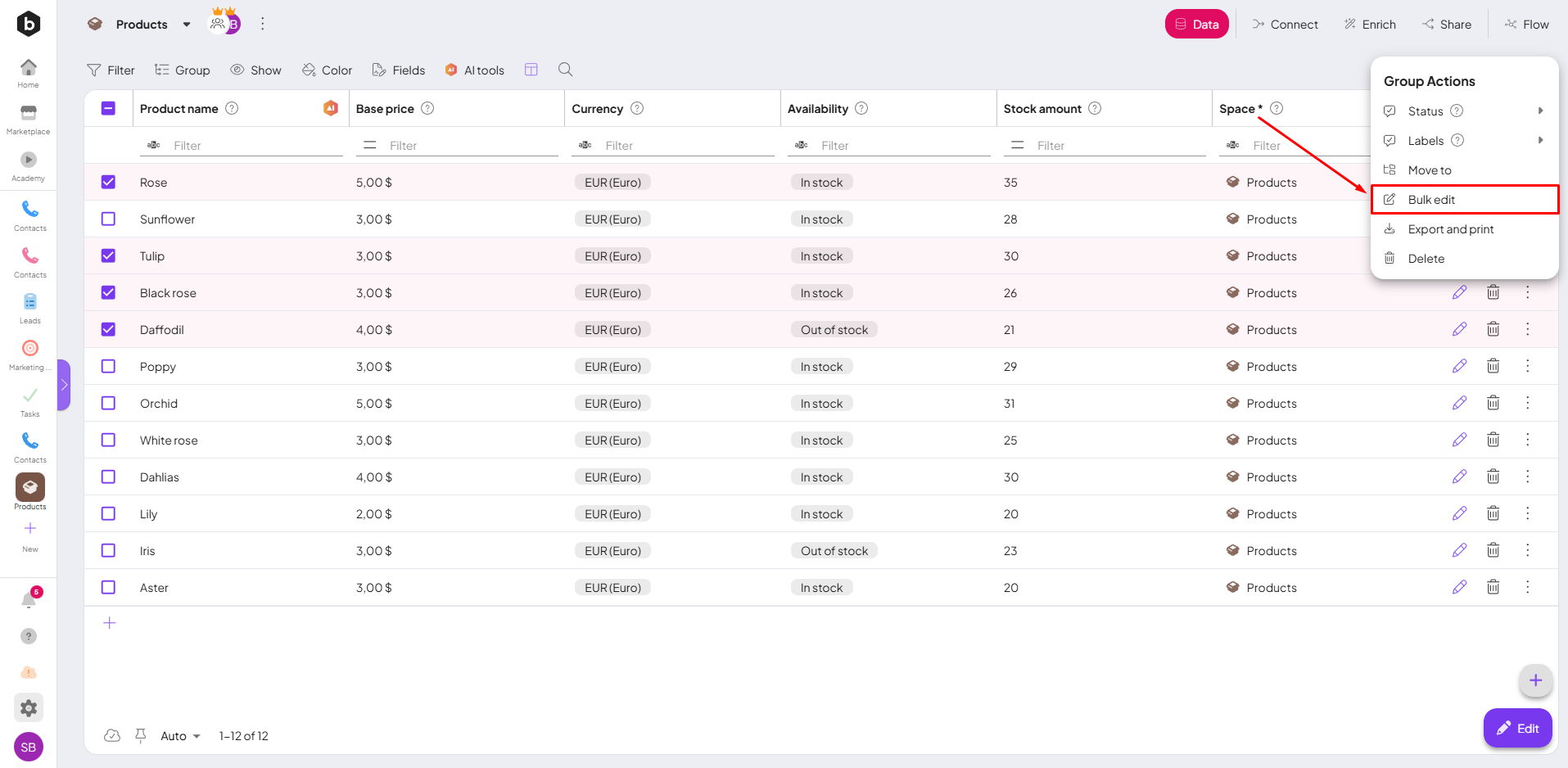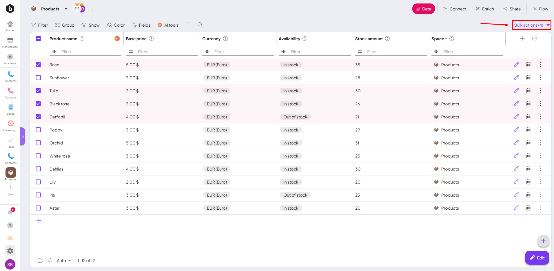 - Select Records: You can select one or more records within your spaceIn Boost.space, a space is a subunit within a module that helps organize and categorize data, ensuring clarity even with large volumes. For example, within the Contacts module, you might have spaces like "Client Database" or "Supplier Database." Access to each space is restricted to users who have created it or have been granted access.. Once you select the records, a Bulk Actions button will appear at the right side of the screen.