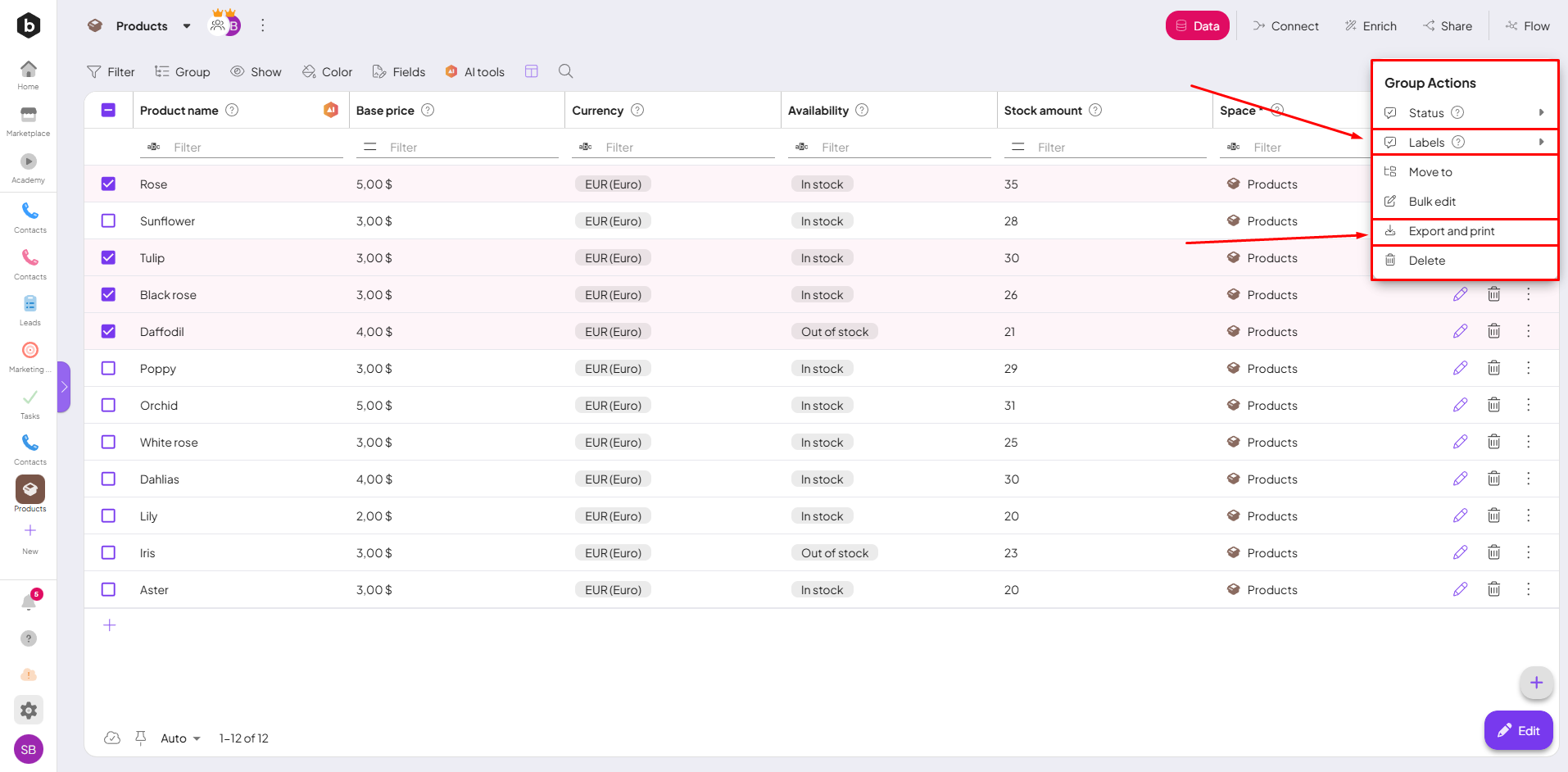 - A dropdown menu will appear for you to choose from. For example, you can bulk add a labelIn Boost.space, a label is a tag that can be added to items within a module. It's a flexible tool used to categorize and organize data, making it easier to customize workflows and processes. to all the selected records. This action will be applied to every recordIn Boost.space, a record is a single data entry within a module, like a row in a database. For example, a contact in the Contacts module or a task in the Tasks module. you have chosen, and you’ll see it reflected in your database after a brief moment.Boost.space also offers a straightforward way to export your data. Once you’ve selected your data, you can export it directly to an Excel file. The exported file will include the columns you currently have visible in your viewport, and the order of the columns will be the same as it appears on the screen. This ensures that the exported data matches the layout you’re working with.