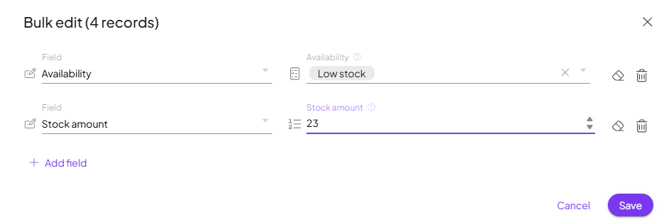 You can also update multiple fields at once using the Bulk Edit feature. Simply click on Bulk Edit, and add the fields you’d like to change. This makes it quick and efficient to apply updates across many itemsItems are rows in records (order/request/invoice/purchase...) simultaneously.
