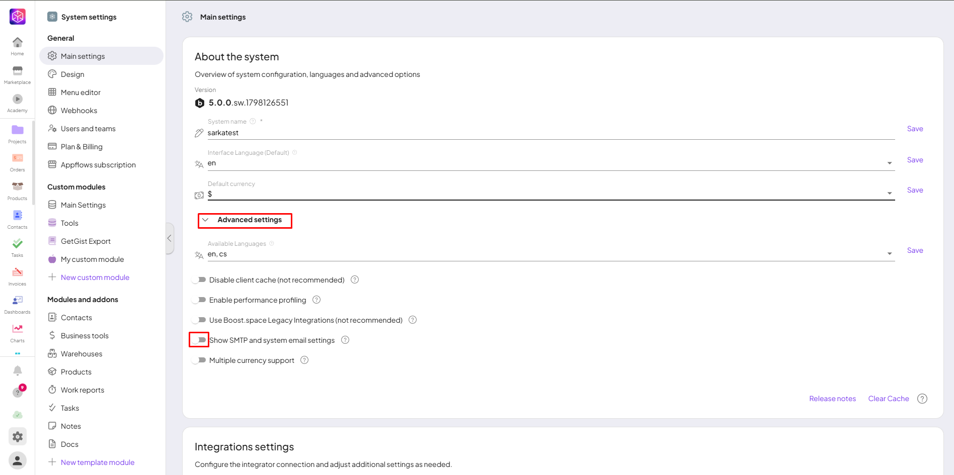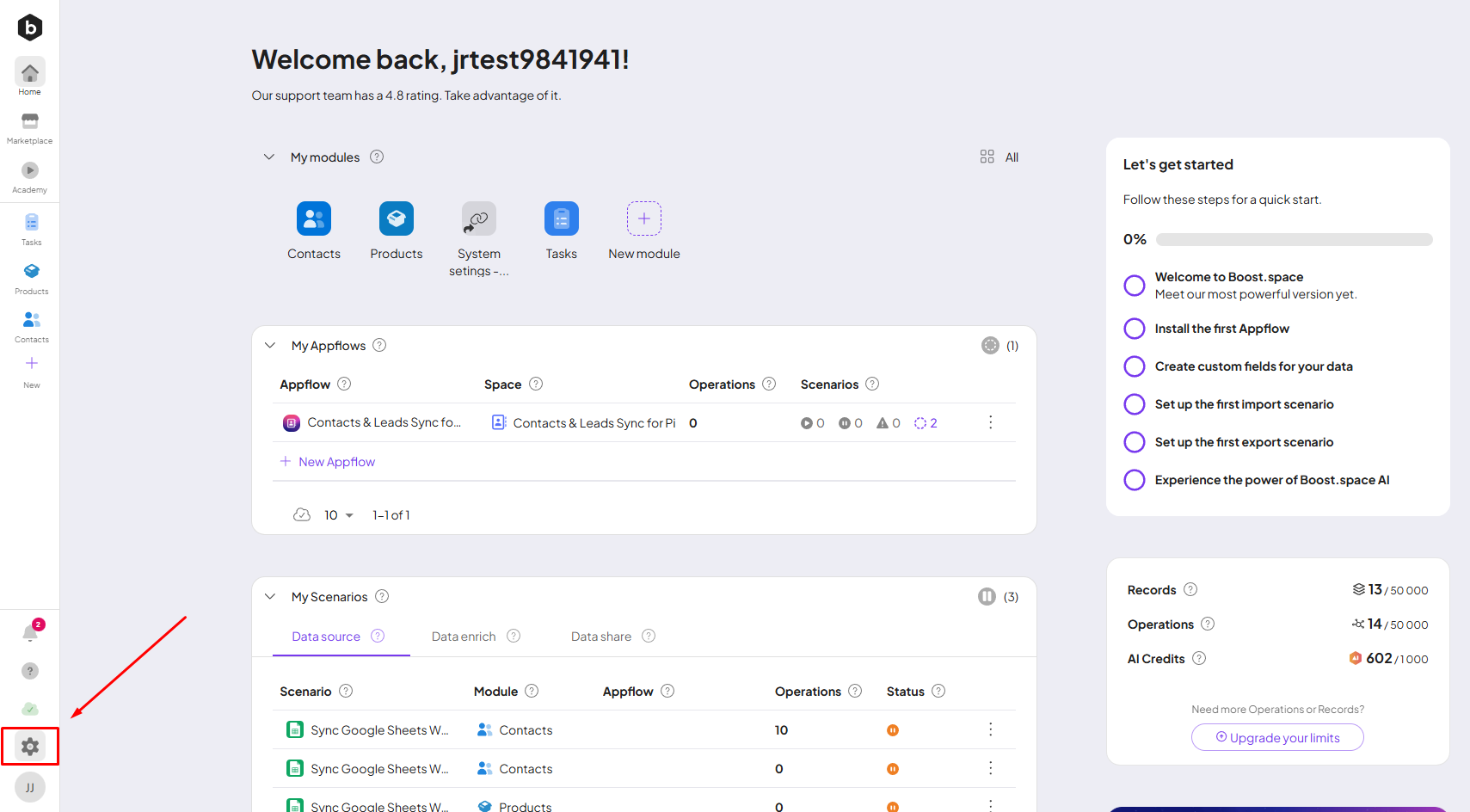 1. Navigate to your system settingsMain settings of the Boost.space system that is accessible only by admins. You can change a variety of things here (custom fields, actions and triggers, design, etc.)