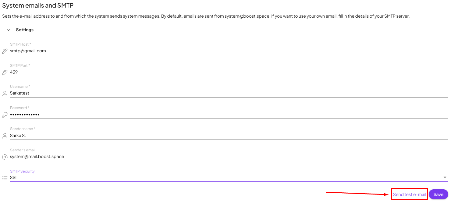 After you set up your SMTP, you can test the changes with a “send test e-mail” button.