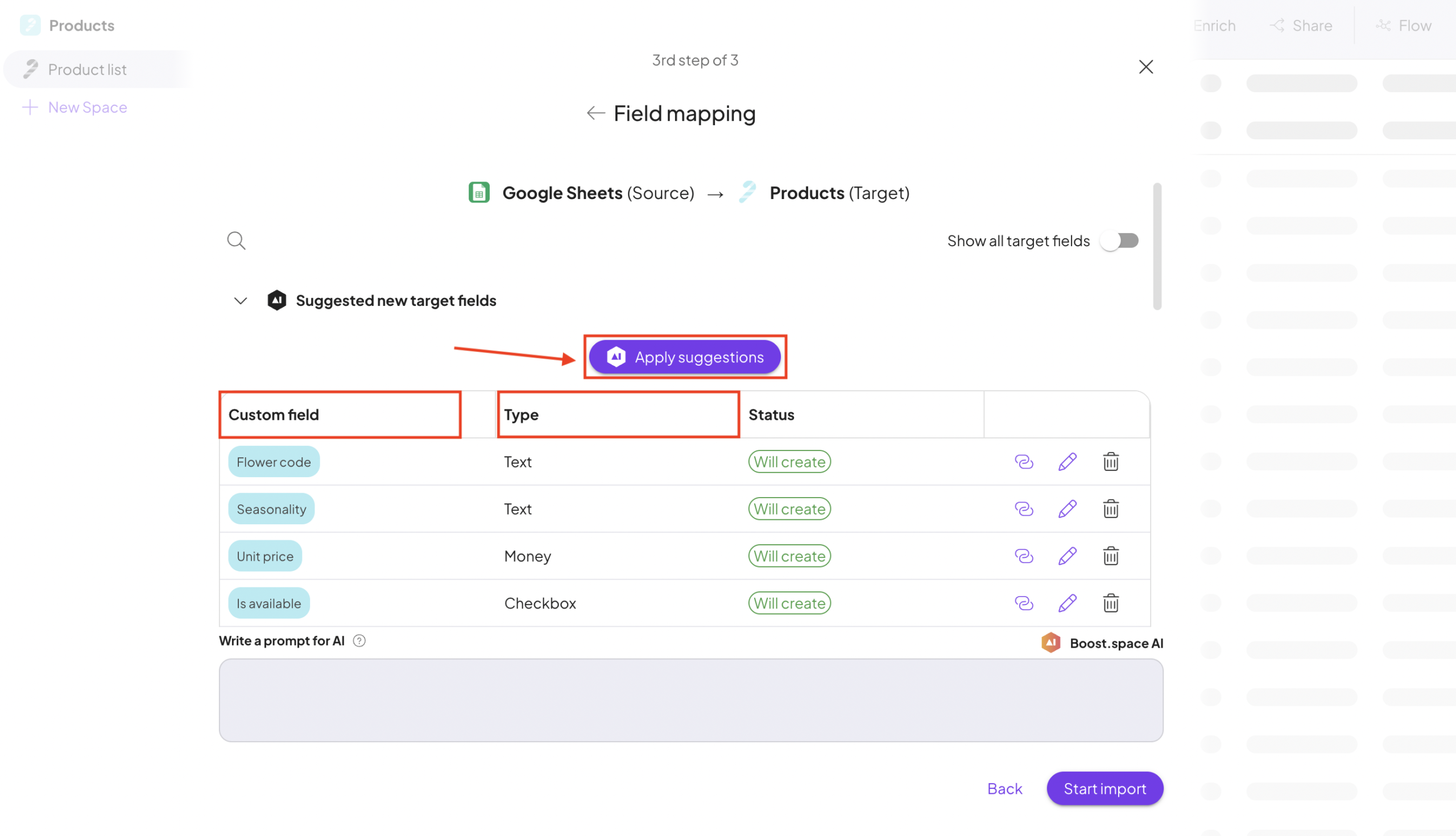If some fields do not yet exist, the system can also suggest creating new custom fields, including a recommended field name and field type (such as Text or Number).