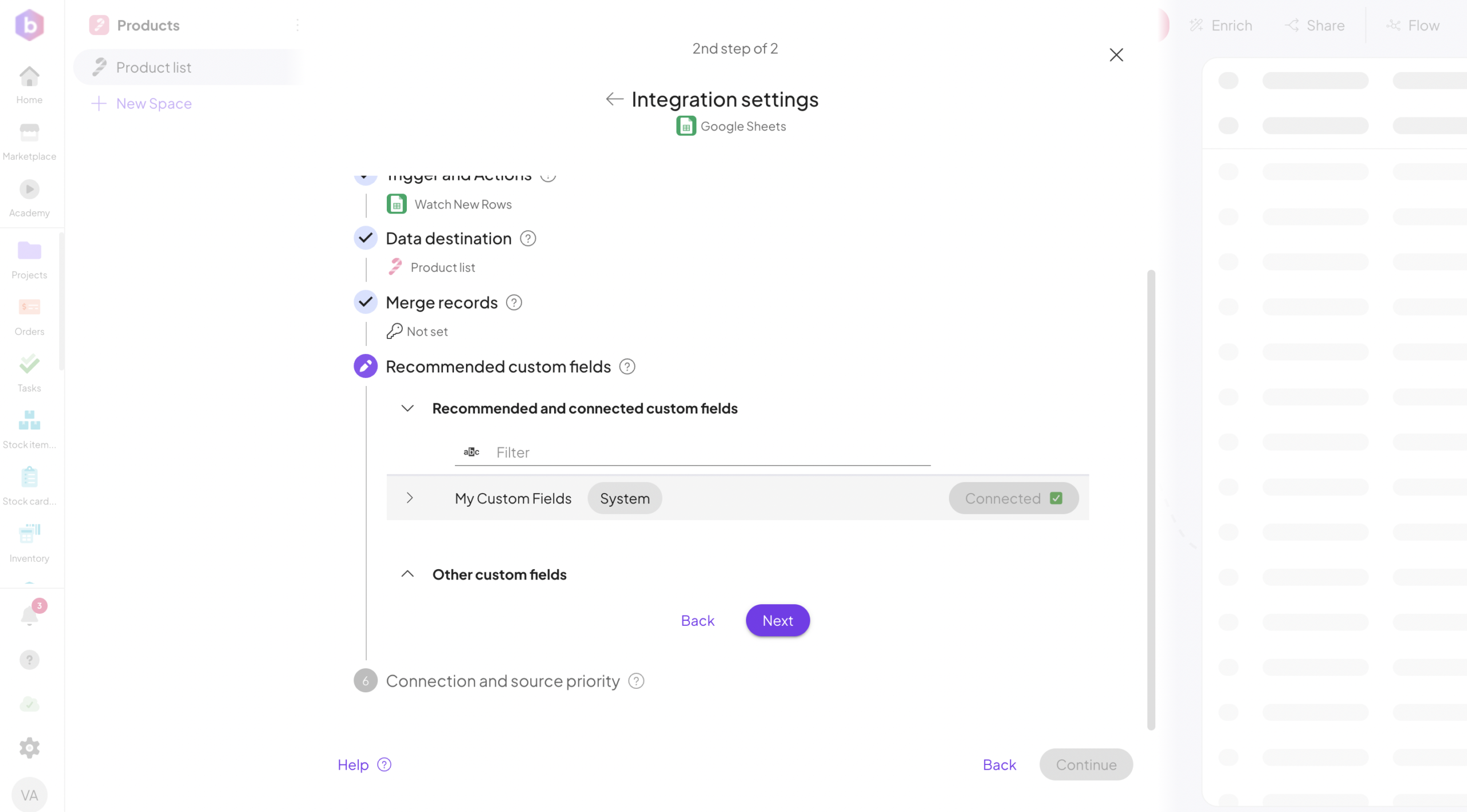 For any fields that are not yet mapped, the system automatically suggests creating new custom fields.