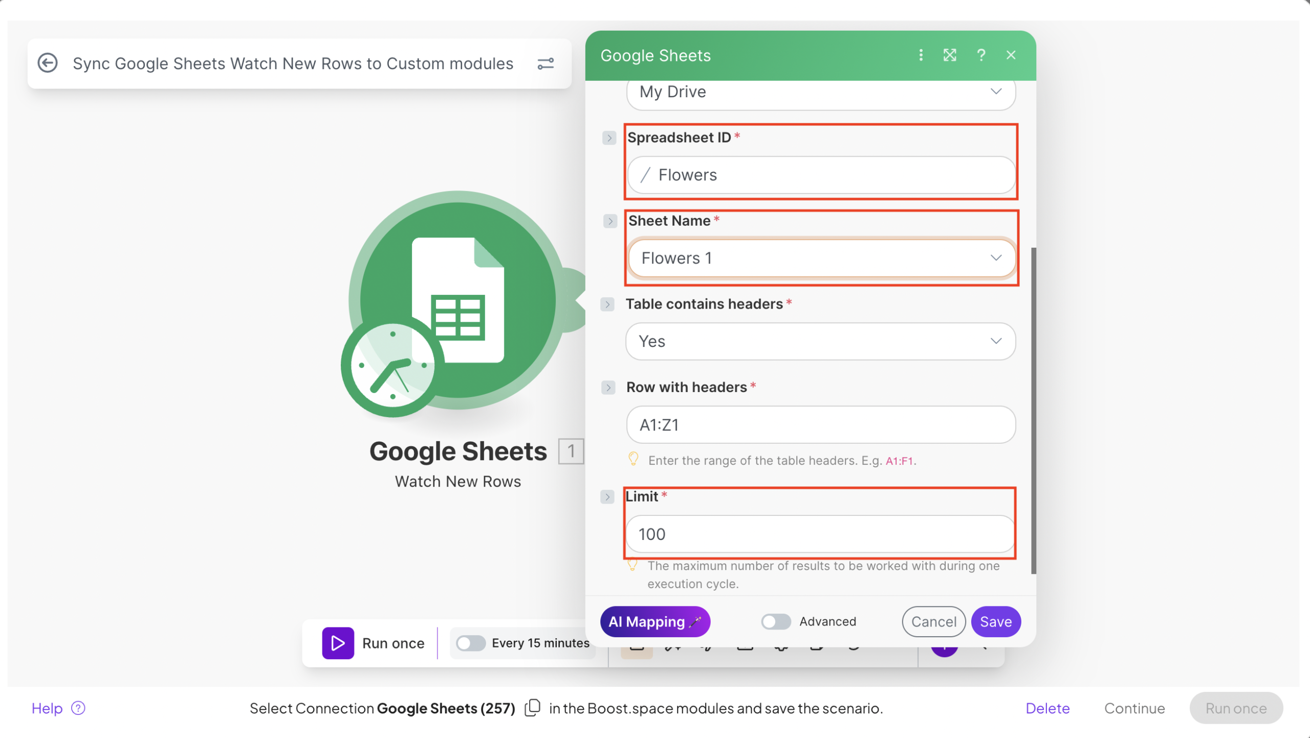 Sync Data into Boost.spaceA platform that centralizes and synchronizes company data from internal and external sources, offering a suite of modules and addons for project management, CRM, data visualization, and more. Has many features to optimize your workflow!: AI MappingMapping links the modules in your scenario. When you map an item, you connected the data retrieved by one module to another module to perform the desired action. For example, you can map the email address and subject lines from the Email > Watch emails module to Google Sheets > Add a row and create a spreadsheet of email addresses...