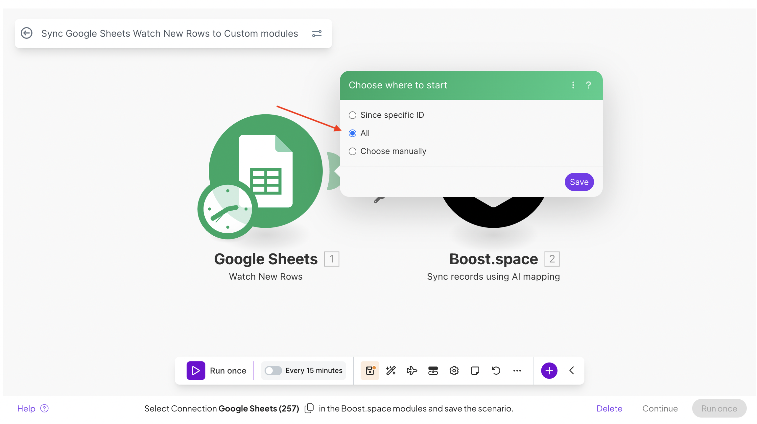 Choose where to start: If you want to sync all existing records from the source tool, select: All.