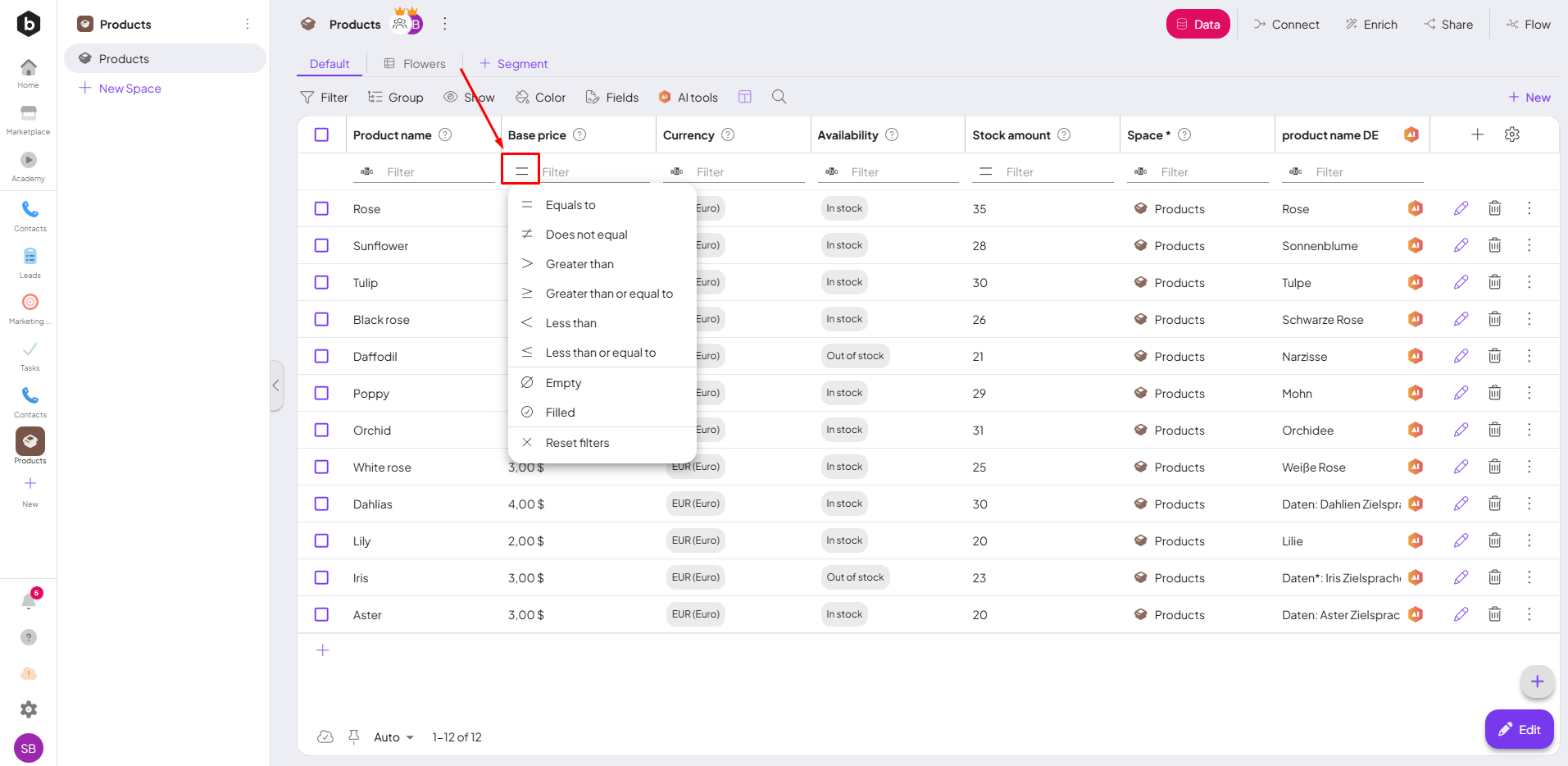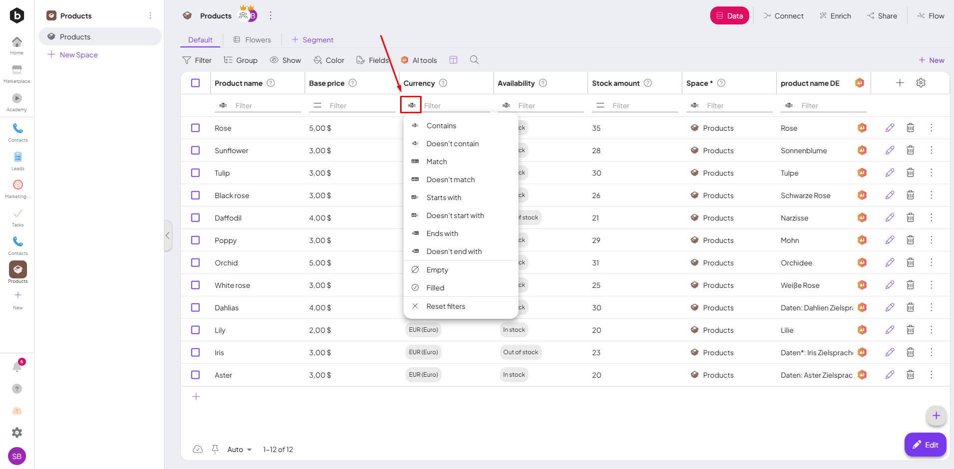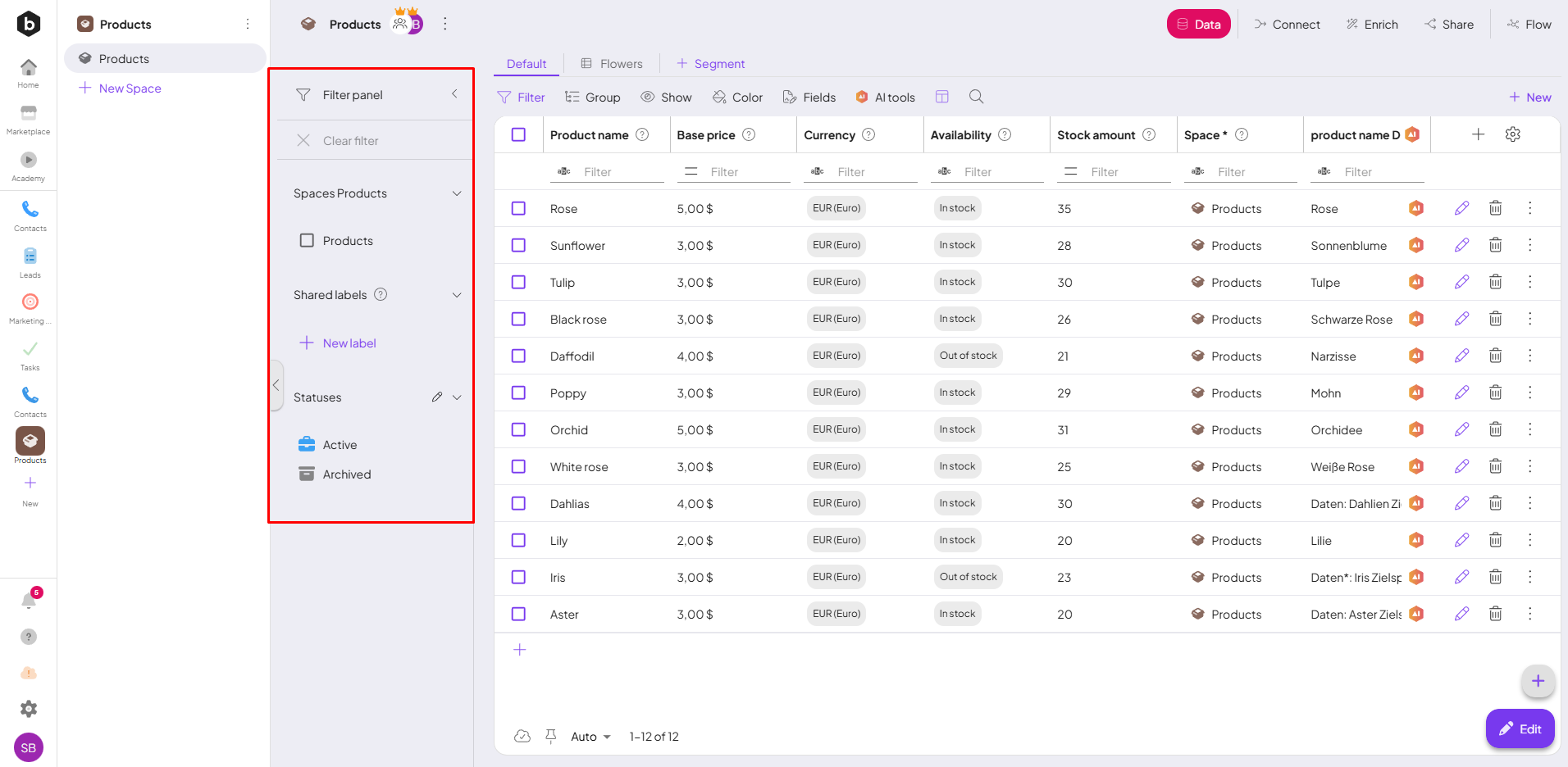 Navigate a large number of records in Boost.space with two types of filtering: Columnar filtering for specific conditions and a versatile filtration panel offering spaceIn Boost.space, a space is a subunit within a module that helps organize and categorize data, ensuring clarity even with large volumes. For example, within the Contacts module, you might have spaces like "Client Database" or "Supplier Database." Access to each space is restricted to users who have created it or have been granted access., labelIn Boost.space, a label is a tag that can be added to items within a module. It's a flexible tool used to categorize and organize data, making it easier to customize workflows and processes., statusIn Boost.space, statuses are indicators assigned to records within modules to represent their current state or progress. They can be system-defined, such as "Active" or "Done," or custom-created to fit specific workflows. Statuses help track and manage tasks, projects, and processes efficiently., and user-based filters.