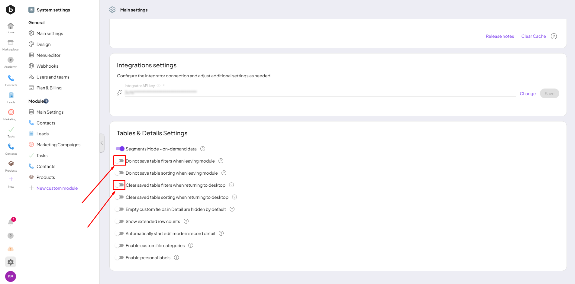 When you use filters in a module or in a space, your filters are automatically saved even after you leave. You can change this in the main system settingsMain settings of the Boost.space system that is accessible only by admins. You can change a variety of things here (custom fields, actions and triggers, design, etc.).