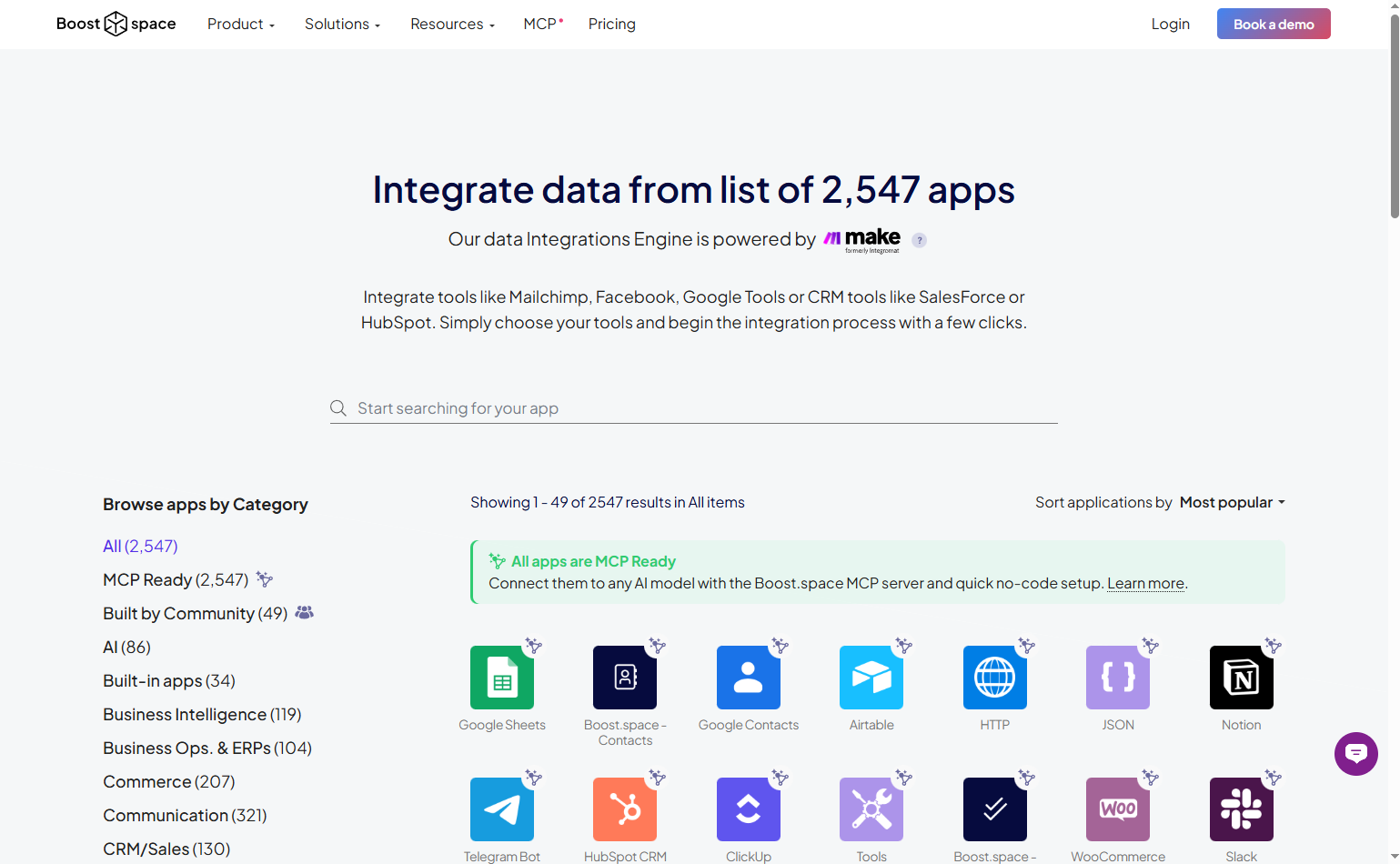 Boost.space offers more than 2500+ third-party integrations that you can connect to, which you can explore on our integrations page. These direct integrations allow you to seamlessly connect various tools and streamline your workflow within our platform. However, if you don’t find your desired application among our direct integrations, don’t worry—there are other ways to connect it to Boost.space.