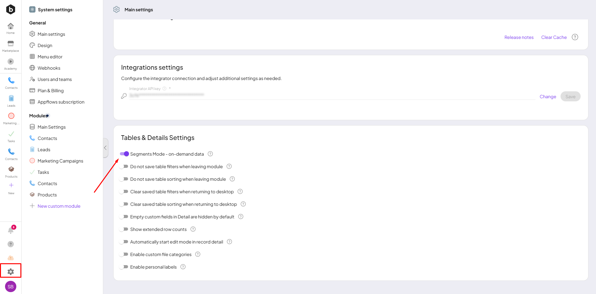 - Turned on manually in the System SettingsMain settings of the Boost.space system that is accessible only by admins. You can change a variety of things here (custom fields, actions and triggers, design, etc.), or