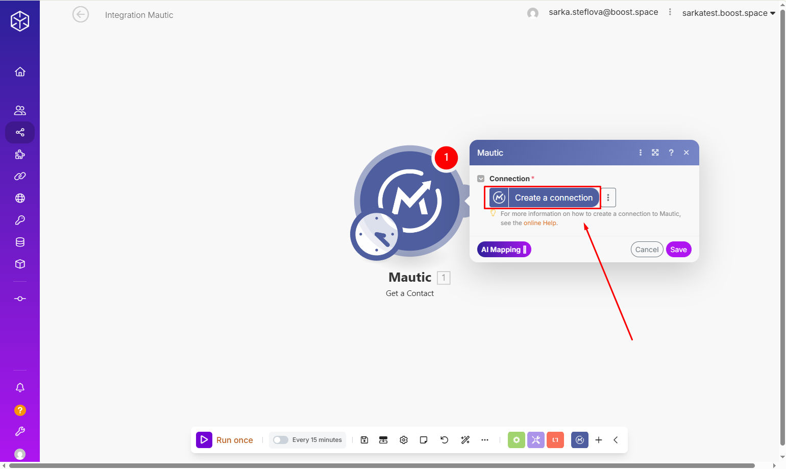 9. – Go to Boost.space Integrator and create a new scenario. Find the Mautic module you want to use and click “Create a connection”.
