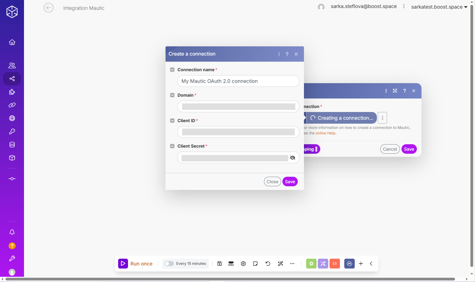 10. – In Boost.space Integrator in the ‘Mautic OAuth2 API‘ credentials section, fill in the “Conection Name” field with the name you’ve chosen for your credentials and “Domain“.