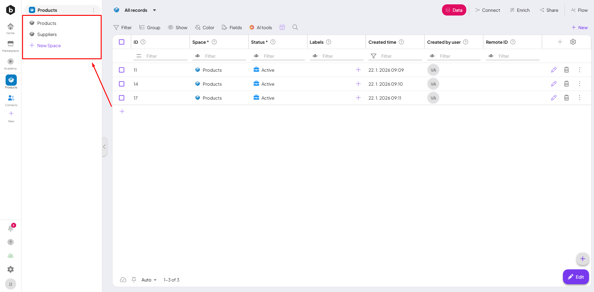 Spaces are subunits of modules where data is organized. Spaces act as organizational units that help categorize data logically, making it easier to access and manage. Creating a spaceIn Boost.space, a space is a subunit within a module that helps organize and categorize data, ensuring clarity even with large volumes. For example, within the Contacts module, you might have spaces like "Client Database" or "Supplier Database." Access to each space is restricted to users who have created it or have been granted access. is simple. Users can define a space, assign it a name, and customize its settings. Once a space is created, it can be tailored to specific needs using templates and statusesIn Boost.space, statuses are indicators assigned to records within modules to represent their current state or progress. They can be system-defined, such as "Active" or "Done," or custom-created to fit specific workflows. Statuses help track and manage tasks, projects, and processes efficiently., which standardize data organization and streamline processes.