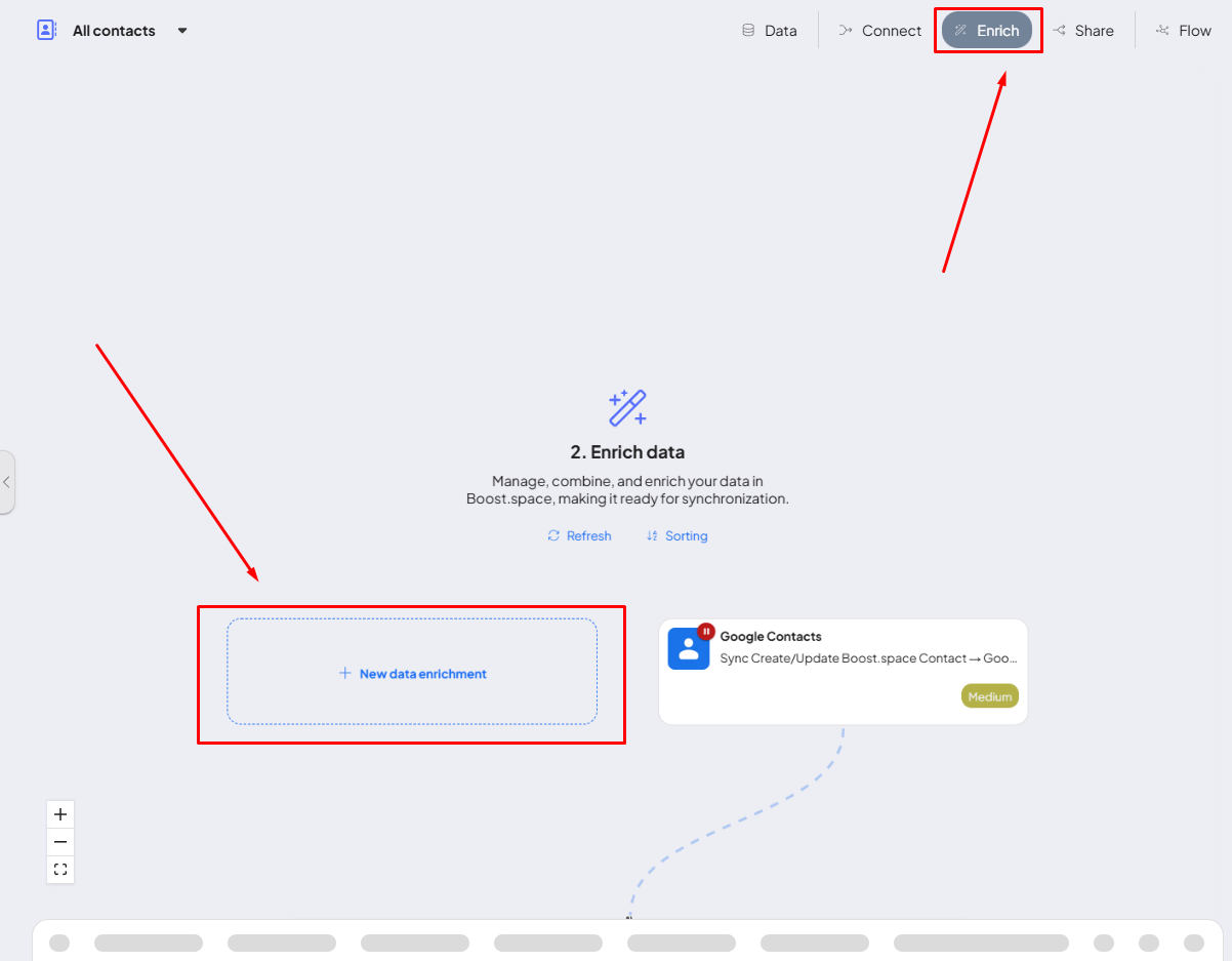 E. The ENRICH view offers a perspective for situations that involve improving or adding value to data within Boost.space. In these scenarios, data is retrieved from Boost.space, processed or enriched—often with the help of external tools like AI—and then saved back into Boost.space as improved information. Here you can also create a new scenario.