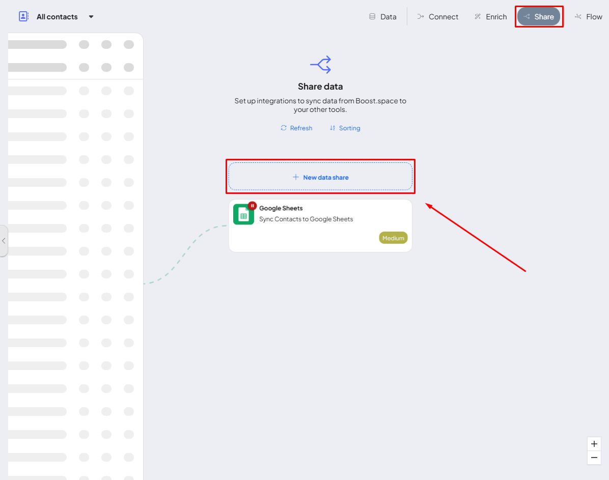 C. The SHARE section displays all outgoing scenarios from the Boost.space system to third-party applications. It also provides an option to add a new scenario. You can learn how to create a Boost.space – third-party application integration in this article.