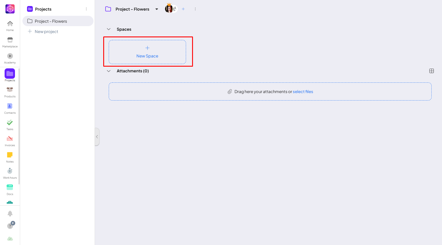 Navigate to your Projects modulea module is an application or tool designed to handle specific business functions, such as CRM, project management, or inventory. The system's modular architecture allows you to activate only the modules you need, enabling customization and scalability as your business requirements evolve. and click on “New space”.