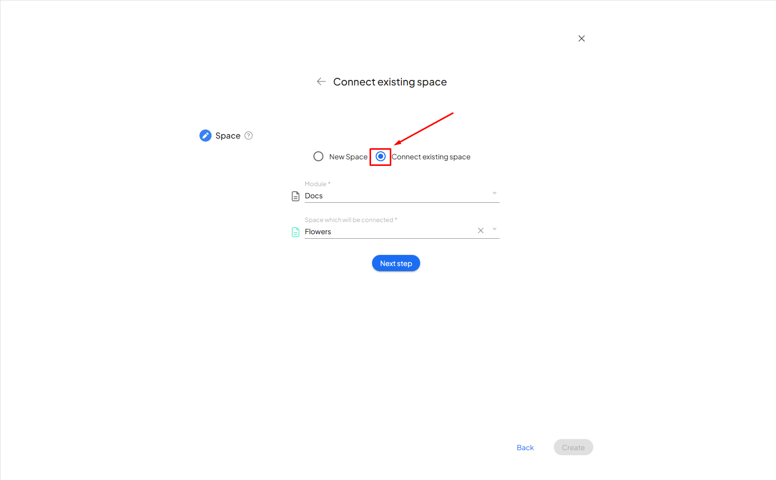 Click on “Connect existing space”. Find the Docs module and space you want to connect the project with and save it.