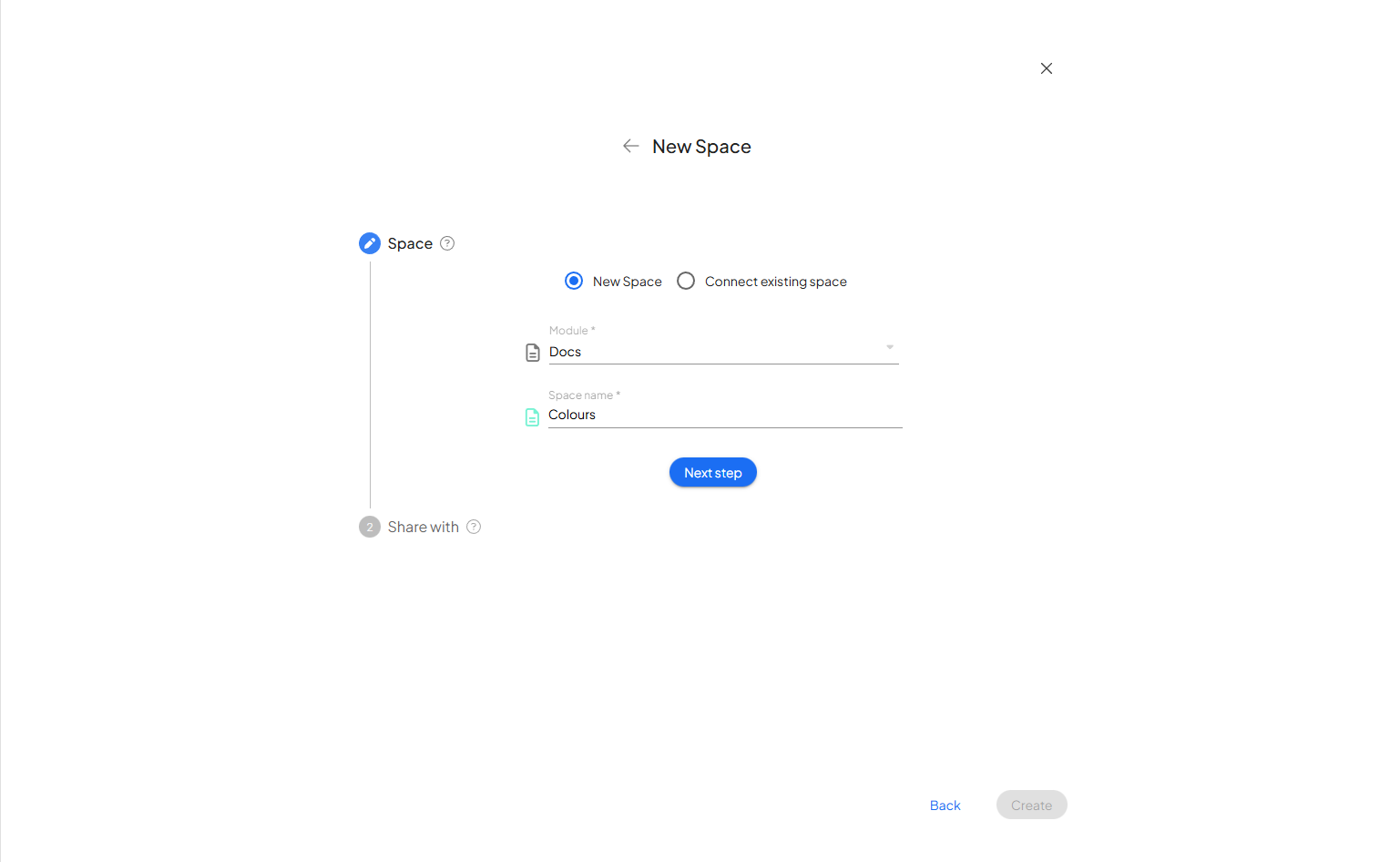From dropdown menu choose the Docs module and name the spaceIn Boost.space, a space is a subunit within a module that helps organize and categorize data, ensuring clarity even with large volumes. For example, within the Contacts module, you might have spaces like "Client Database" or "Supplier Database." Access to each space is restricted to users who have created it or have been granted access.. Click “Next step” and now you can choose with who you will share this space with, and save it.
