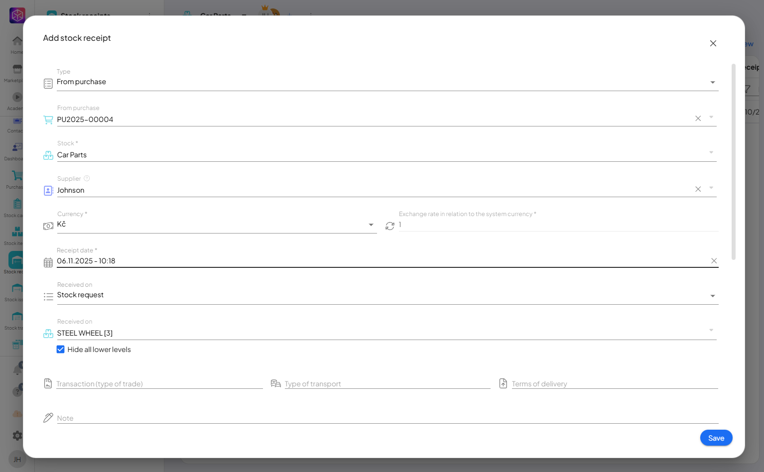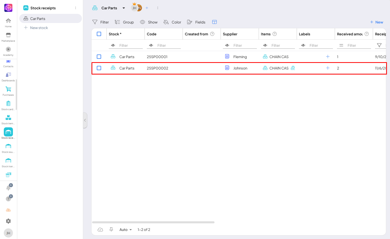 - Receipt recordsIn Boost.space, a record is a single data entry within a module, like a row in a database. For example, a contact in the Contacts module or a task in the Tasks module. – stock itemsItems are rows in records (order/request/invoice/purchase...) that are stocked by the stock receipt. If the item is linked to a purchase (“from purchase”), the stock card and stock item are automatically selected (if the stock item does not exist in the warehouse, it is offered to create it).