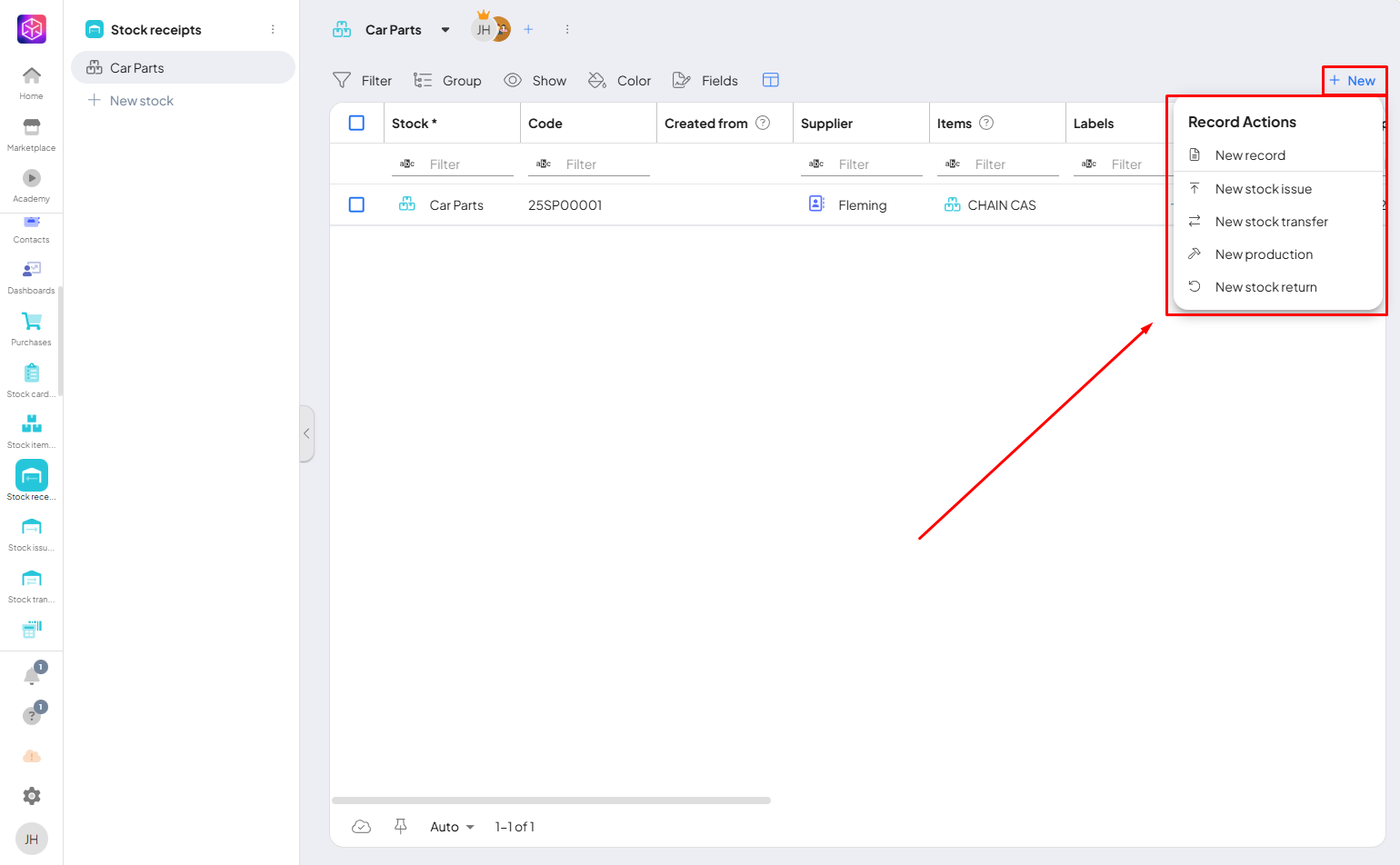 For creating new stock receipt just click on “New” and choose new recordIn Boost.space, a record is a single data entry within a module, like a row in a database. For example, a contact in the Contacts module or a task in the Tasks module.. You can also choose fron other option, but for this case we will use “New record”.