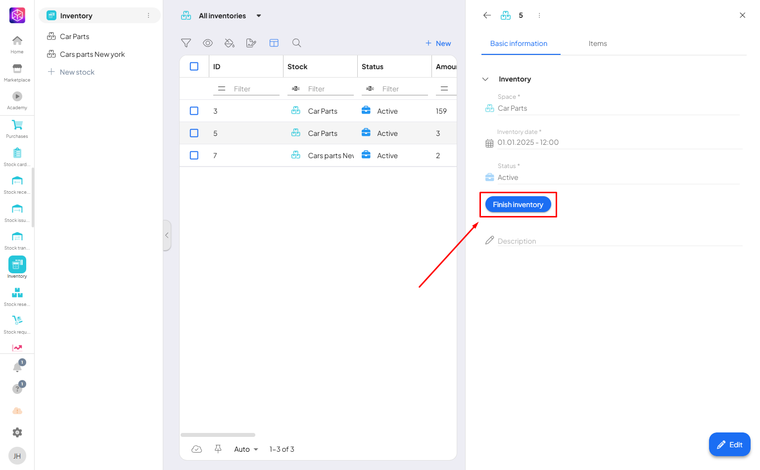 Lets say you did inventory 1.1.2025 and now you want to finish it. So click on “Finish inventory”.