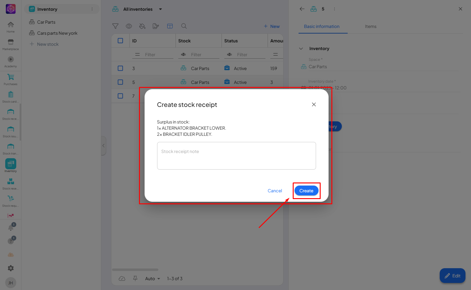 - quantity in the system > quantity in stock → stock item is missing in the warehouse, a receipt is automatically created to which you can add a comment;