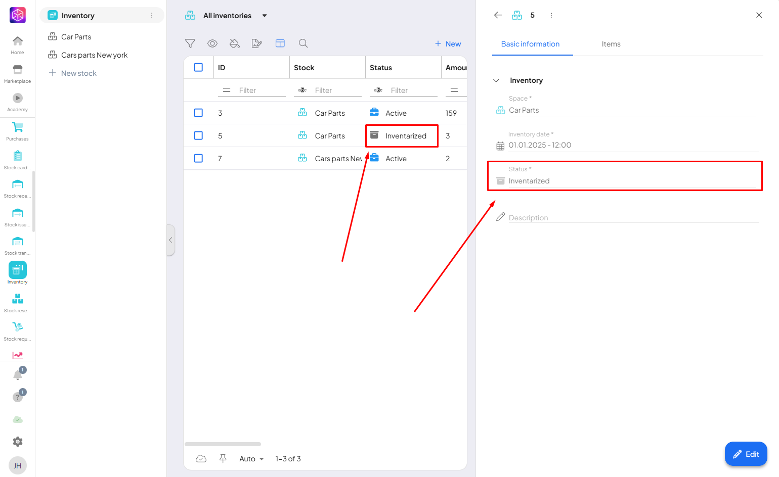 The system will change the statusIn Boost.space, statuses are indicators assigned to records within modules to represent their current state or progress. They can be system-defined, such as "Active" or "Done," or custom-created to fit specific workflows. Statuses help track and manage tasks, projects, and processes efficiently. to inventarized. And it is done!