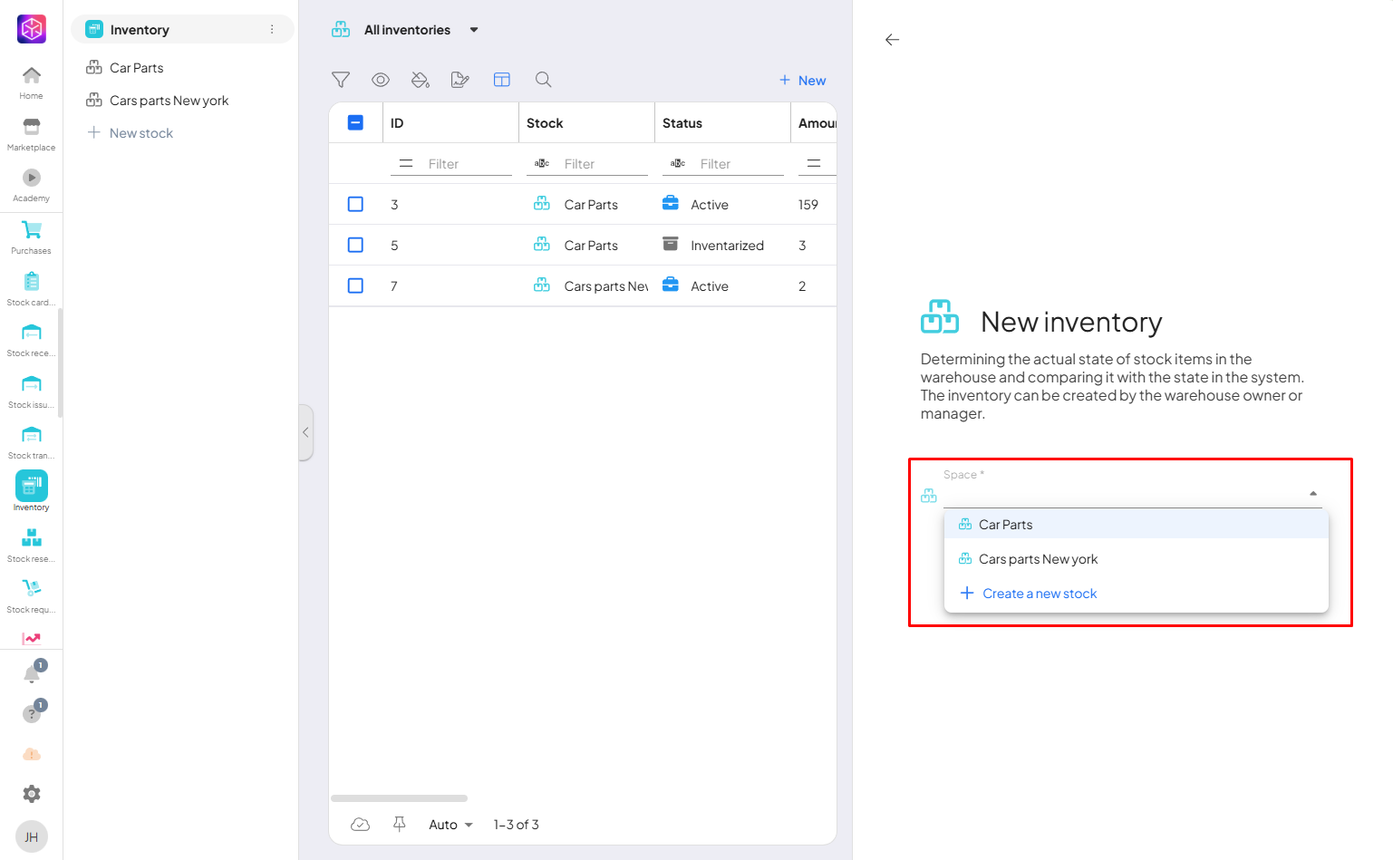 The inventory can be started by the OwnerIn Boost.space, an Owner is a role within a space that grants comprehensive control over that space. Owners can manage members, managers, and other owners, view and manage records, edit space settings—including status lists and labels—and have the authority to delete the entire space. or the Warehouse ManagerIn Boost.space, a Manager is a role within a space that allows an individual to manage members and other managers, view and manage records, and modify space settings, such as status lists and labels..